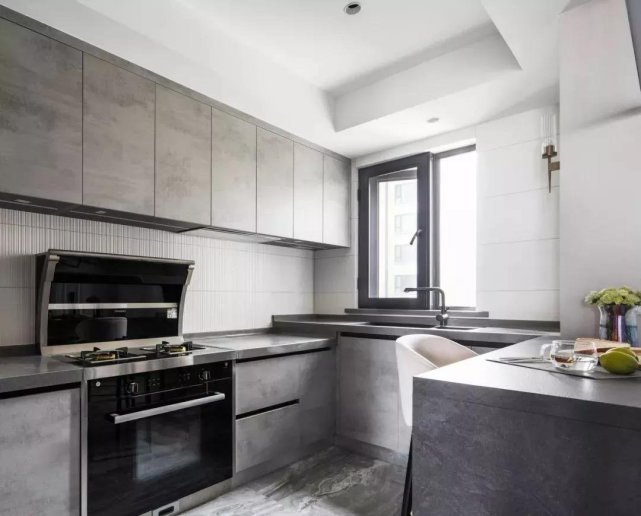 厨房整体后现代水泥灰色调,采光好所以整体不显暗淡,反而别有品味。