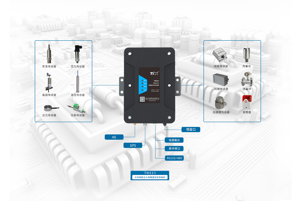6、支持RS485\RS232串口等有线接入方式,满足倾角、雨量、裂缝、倾斜、加速度、报警器等传感器接入需求。