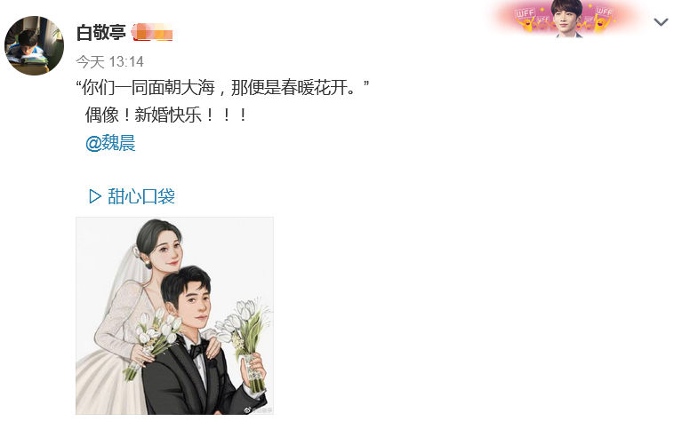 白敬亭的结婚祝福卡点在13:14发,化用了魏晨在《甜心口袋》里的一句歌词。