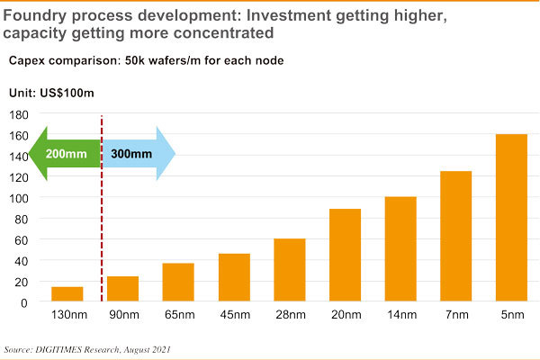 据了解,目前一座月产量为5万片晶圆的12英寸晶圆厂,使用90nm制程节点的成本为24亿美元;若是28nm制程节点,则需要投资60亿美元;如果是目前最先进的5nm制程节点晶圆厂,需要投入160亿美元。虽然先进工艺非常重要,但过于倾斜资源在研发先进工艺上,可能会导致成熟工艺的供应受到影响。在过去的一年多里,汽车芯片就是一个明显的例子,因为大多仍在使用40nm或以上的制程节点。事实上,日常生活里大多数的芯片生产需求最多也就到28nm制程节点。