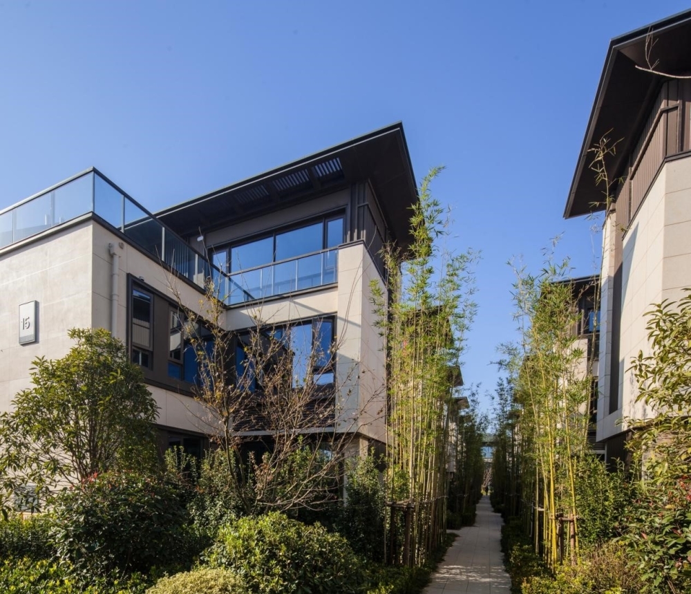 在缦云府,设计师将合院与叠墅利用小区内主道路分隔,其界线规整明确,同时,利用地形高差将合院抬高,增强其居住的私密感。