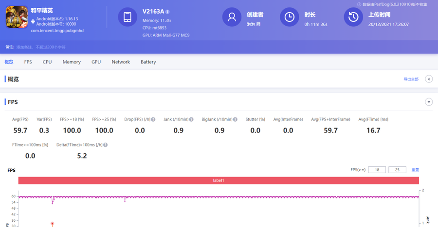 《和平精英》PerfDog软件帧率测试结果△