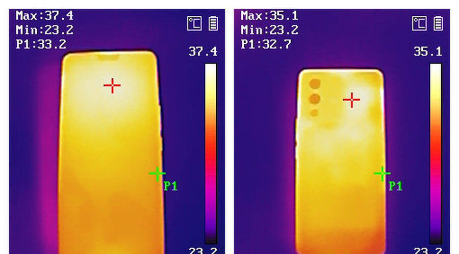 在20度左右的室温,连续玩30分钟90帧《王者荣耀》游戏后,测得机身正面最高温度为37.4度,背面最高温度为35.1度,温度控制得不错,对手感影响很小。