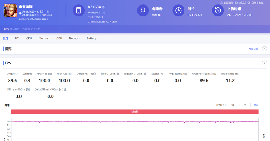 《王者荣耀》游戏支持超高帧率和极致画质同时开启,PerfDog软件记录到的平均帧数为89.6帧,帧数全程几乎就是一条直线,即使是多人团战、放大等场景,都没有明显的帧数波动,能够充分发挥90Hz屏幕的高刷优势,带来十分流畅的画面效果。值得一提的是,官方表示vivo S12 Pro《英雄联盟手游》首批90帧也在跟进中。