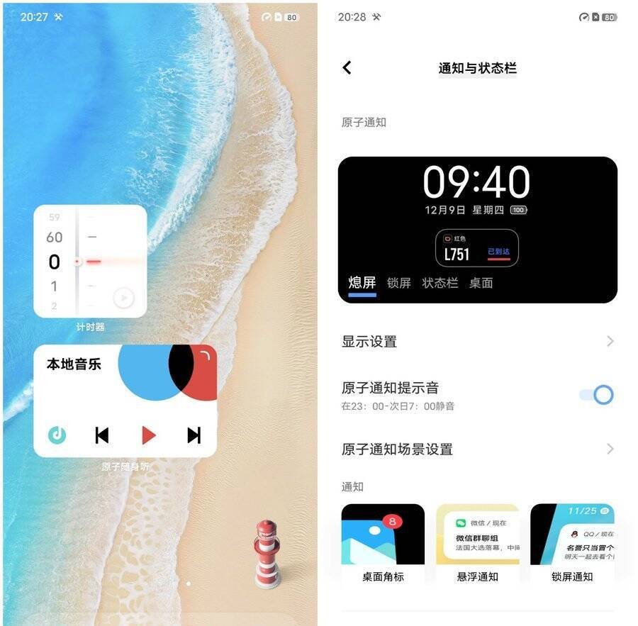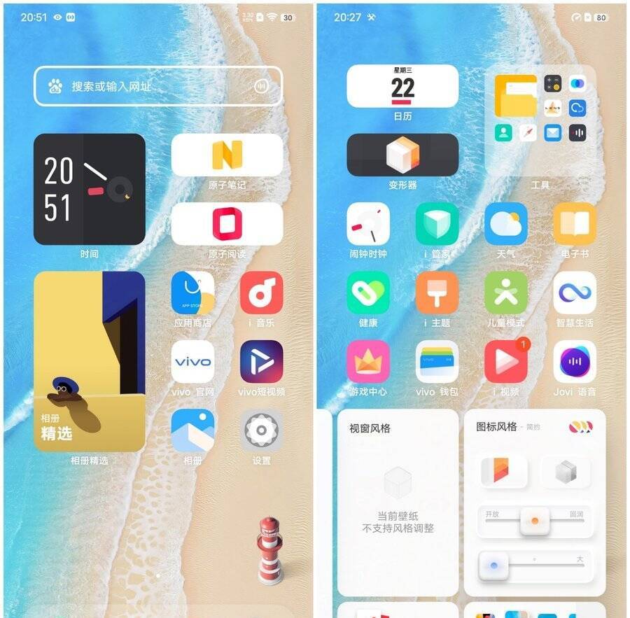 OriginOS Ocean将原来两种风格的桌面进行了融合,延续了此前的华容网格设计,桌面图标、文件夹均可调节不同尺寸,支持原子组件功能,系统图标色彩、形状风格均可调节,个性化程度很高。