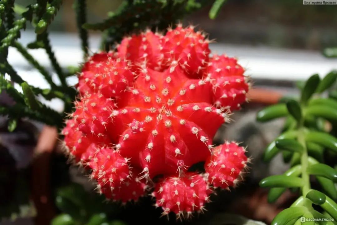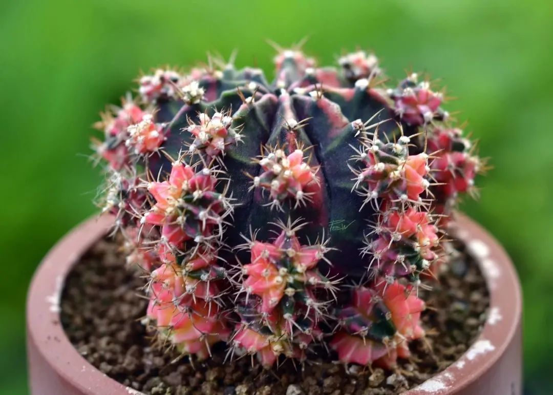 如果是整个球体都是锦化绯牡丹,将无法进行光合作用的绯牡丹(全锦)嫁接在火龙果的枝条上,就变得特别好养,火龙果的枝条作为砧木,只需要保持砧木存活,绯牡丹就可以长得很好,用普通的仙人掌土或多肉土都可以栽种得很好。