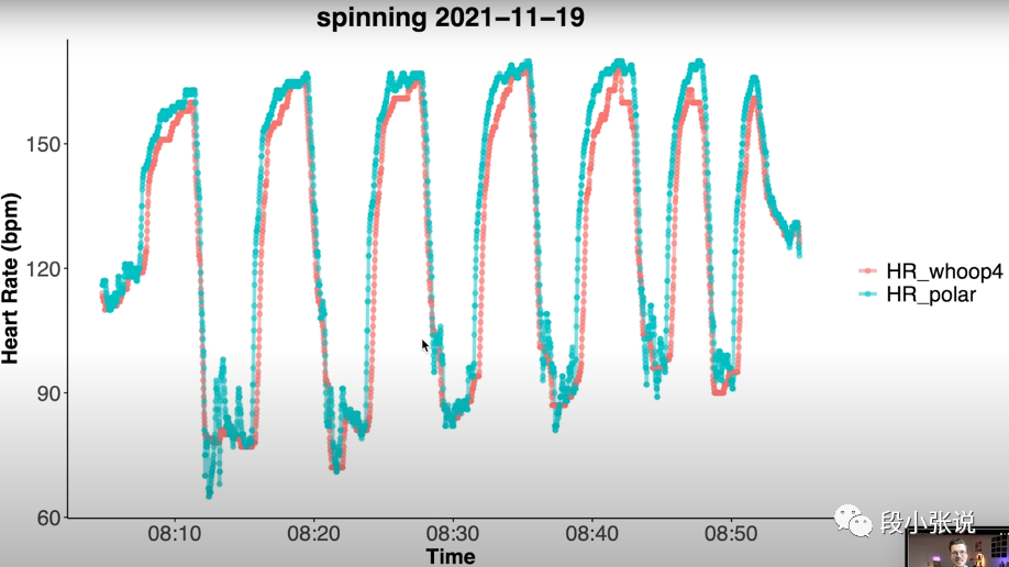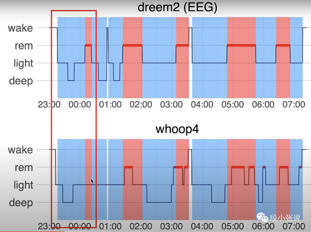 用户自然关心,这个每秒100次的数据采集,准确度究竟如何?我个人通过跑步机(电极测量),Applewatch和Whoop对比,心率数值基本保持一致。近期发现油管另一位大神(Quantified Scientist)通过Whoop数据和心率带对比,以及Whoop睡眠周期和脑电图(EEG)对比,看到Whoop数据基本还是可靠的(在举重运动时心率准确率偏低)。