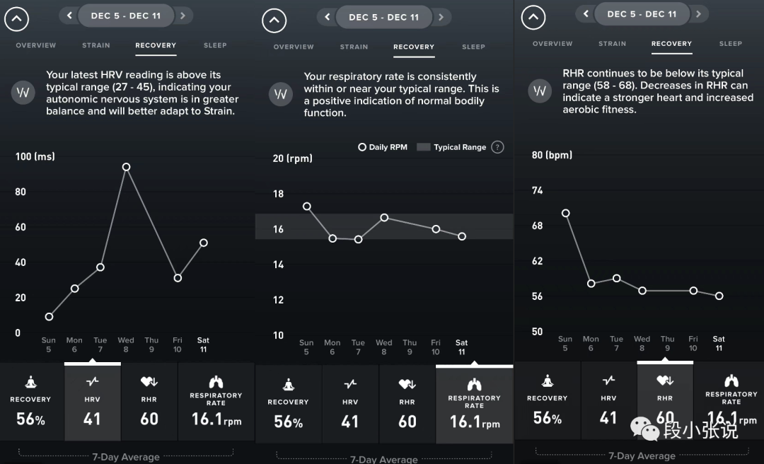 更深层次的,植物神经系统分为交感神经(压力状态下活跃)和副交感神经(放松状态下活跃),如果HRV持续走低(变异性下降,说明心脏跳得很机械),说明一直处于压力状态。而持续提升的HRV说明健康状态良好,可以进行新一轮的运动来刺激身体,达到更好的健康水平;