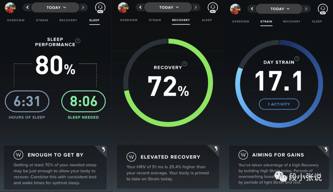 2)APP强调每日“Strain/运动 - Recovery/恢复 - Sleep/睡眠”的循环;