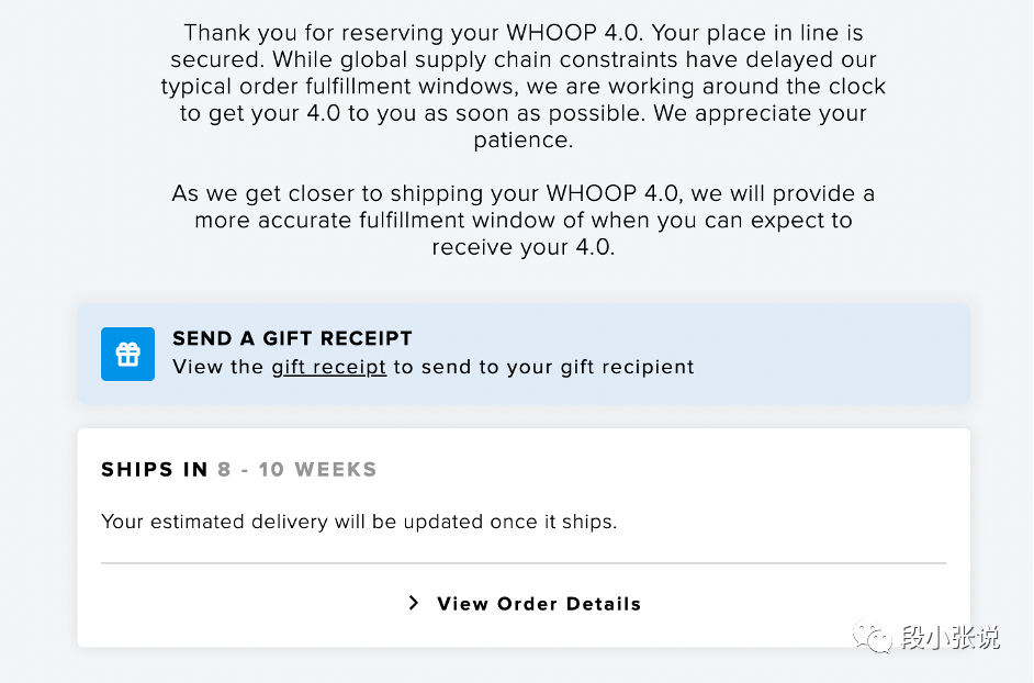 实际上,我在9月1号下单的whoop 3.0,直到 10月26号才真正发货。按照官网的说法,全球供应链紧缺对生产造成巨大冲击(global supply chain constraints),但我觉得还是美帝创业企业离华强北太远,如果国内公司下单后2个月发货,供应链负责人早就应该被换掉了。