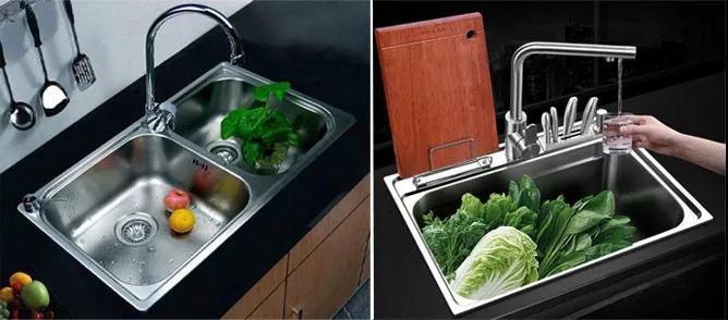 双盆水槽可以分类洗,两边同时用,但受长度限制,不能洗太大的东西。单盆水槽比较长,可清洗比较大的东西,是小厨房的首选,通常需要加一些配饰,如沥水篮,套盆。