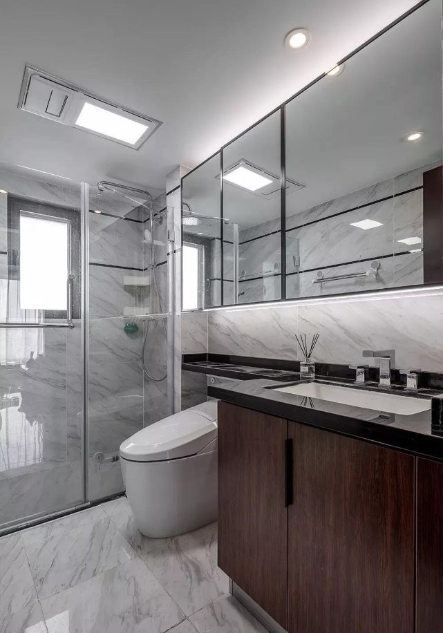 卫生间台面的石材延伸到了马桶上方,可以方便放一些小物件,上方的镜柜一直拉通做满。