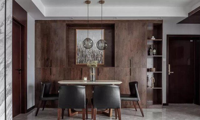入户右侧是餐厅区,业主有储酒的需求,定制了一整面墙的餐边柜,可收纳、可展示,配色和质感对空间的整体感影响是很重要的。深色纹理和皮质,质感+1。
