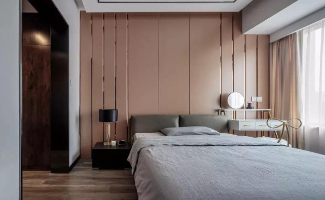 主卧背景使用皮质硬包饰面,使空间规整而干练,简洁的线条,视觉上给人纵向的延伸感。