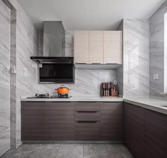 厨房装修可以选择简洁一点,主要空间足够大,做饭时候能发挥开就可以了。另外厨房要做好相应的安全防护措施,煤气罐等要放在干燥的地方,建议安装一个警报器,随时监控。当然了油烟机是必不可少的,也可以适当地添加消毒柜洗碗柜之类的。
