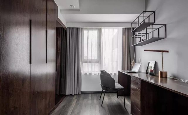 卧室是休息区,在装修里面属于家庭当中安静的角落,所以该部分装修主要塑造一种静谧的氛围。一张床靠墙而放,再配上衣柜和窗帘就很完美了。