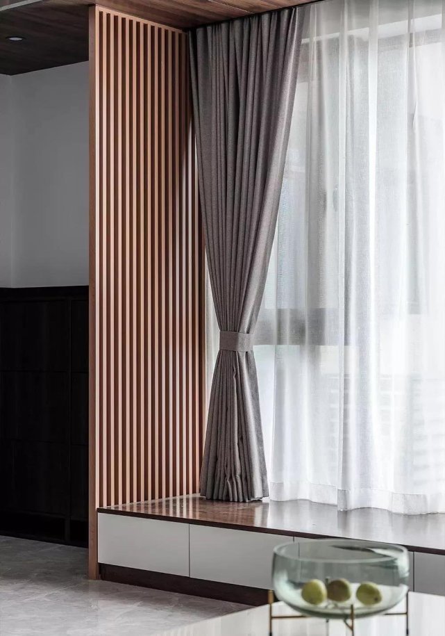 门厅用铝栅格隔出一个玄关,靠墙是一个半高超薄鞋柜20cm,可做斜插式鞋柜。格栅后面是制作的榻榻米,抽屉可以储物,孩子可以在这里做游戏,也是业主休闲的地方。