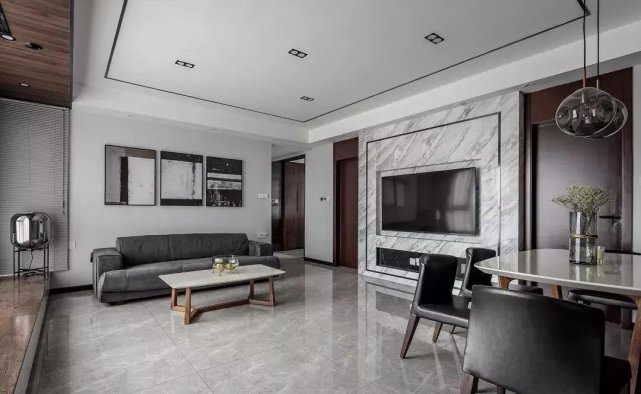 客餐厅中间无阻隔,整个空间看起来简洁宽敞。电视墙两侧的门洞做到顶,整体感协调。电视墙用了石材+不锈钢条,顶面嵌有不锈钢条,整体给人硬朗的感觉。