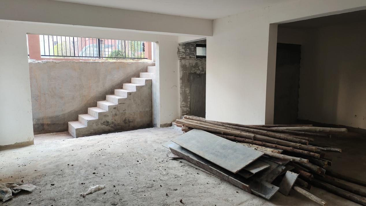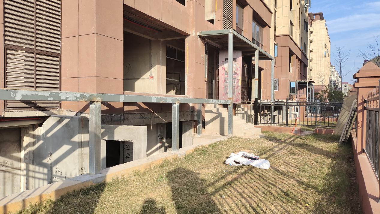 而小高层8栋、21栋、22栋等楼栋一层,全部搭起金属框架,与架空层结合成阳光房。一户正在装修的一层业主室内,已挖出一个楼梯,从楼梯可直接进入架空层,面积约50平方左右。一楼的阳光房外,是墙体和铁门圈起的小院儿。