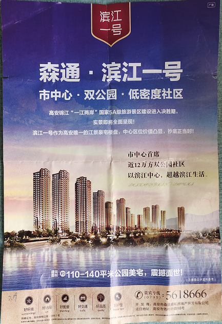 一位业主手里拿着当初购房时的宣传单,只见上面的标题显示:森通滨江一号,市中心、双公园、低密度社区。其下配有“高安锦江‘一江两岸’国家5A级旅游景区建设进入决胜期,实景即将全面呈现”等字样。另有,“滨江一号作为高安唯一的江景豪宅楼盘,中心区位价值凸显,抄底正当时!”等字样。