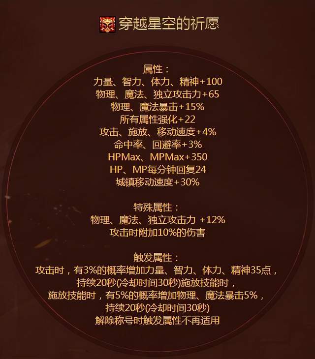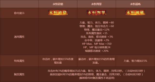 普通称号的四维、三攻属性逐年稳步带来蚊子腿提升,暴击属性在2016三英雄和2017龙之挑战为10%,其后至今维持12%不变,其他属性已维持六年无变化。