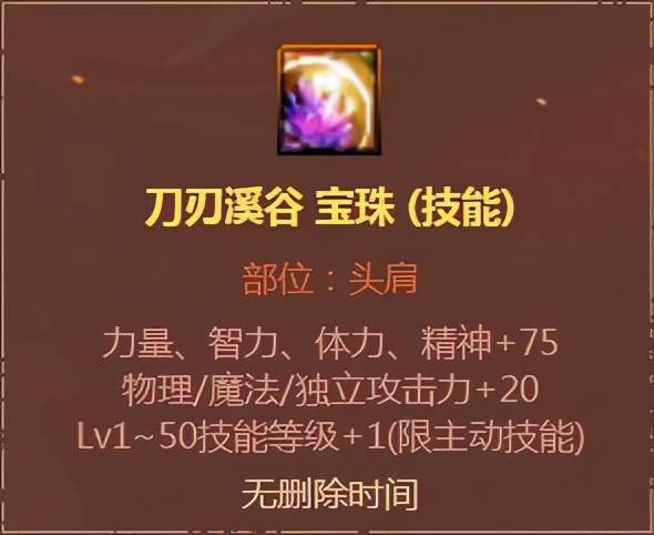 2019年:四维+75 暴击+5% 1-50主动技能+1