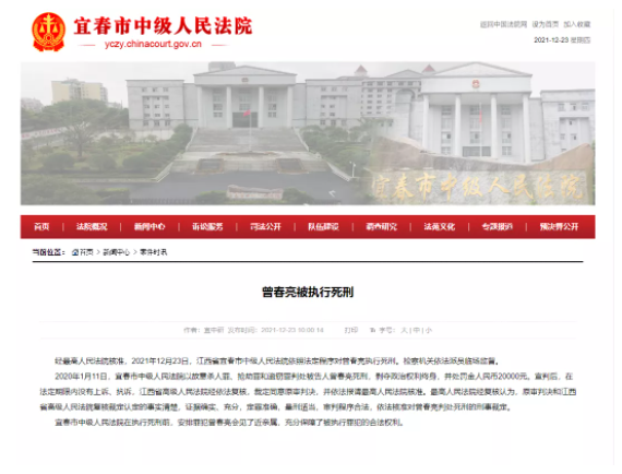 江西宜春市中级人民法院发布案件时讯:经最高人民法院核准,2021年12月23日,江西省宜春市中级人民法院依照法定程序对曾春亮执行死刑。检察机关依法派员临场监督。宜春市中级人民法院在执行死刑前,安排罪犯曾春亮会见了近亲属,充分保障了被执行罪犯的合法权利。