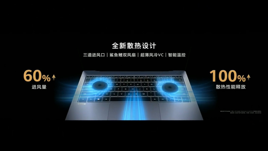 在散热方面,华为MateBook X Pro采用了全新的散热设计,包括三道进风口、鲨鱼鳍双风扇、超薄风冷VC,进风量提升60%,散热性能释放100%。