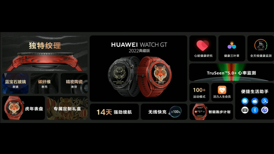 同时,华为也带来了HUAWEI WATCH GT 2022典藏版,结合了2022年虎的元素,采用高分子碳钎维符合材料以及蓝宝石玻璃表镜,售价3688元。