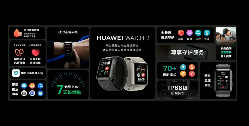 HUAWEI WATCH D可做到无感血压趋势检测,能够识别心血管疾病风险,做到日间高压提醒,异常节律筛查等,对高血压等用户可做到全天候的监测。同时HUAWI WATCH D的用户可享受到免费的 1年尊享守护服务,做到全天候专业健康服务,包括私家医生诊断、三甲专科问诊、专家挂号协助。