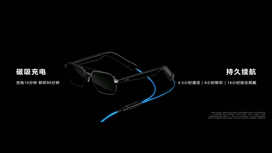 续航方面,华为智能眼镜支持4.5小时通话、6小时聆听以及16小时综合佩戴,采用磁吸充电方式,充电10分钟便可聆听80分钟。光学镜框1699元,太阳镜款1899元。