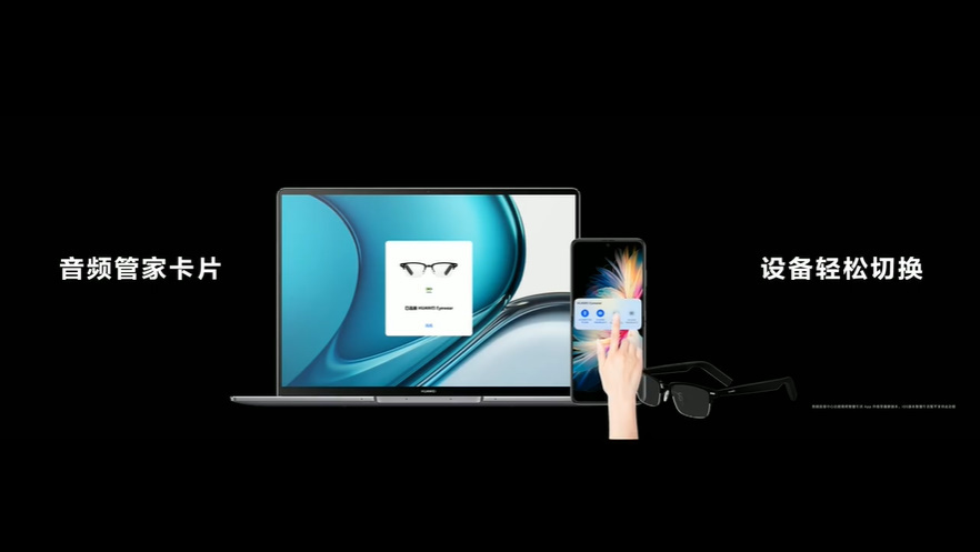 另外新发布的华为智能眼镜是华为首款搭载HarmonyOS的智能眼镜,能够做到设备双连接以及智能弹窗,搭配终端的音频管家卡片使用,可实现连接的设备轻松切换。