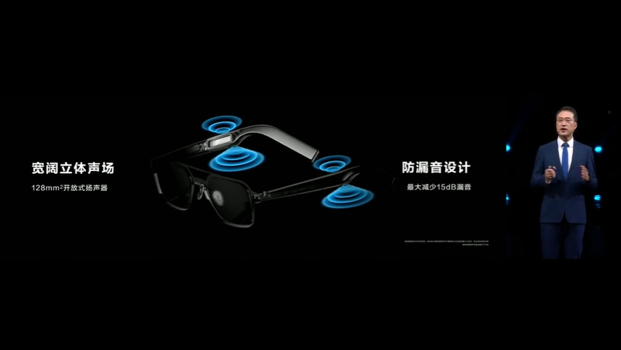 而所搭载的128mm²开放式扬声器是华为智能眼镜的一大亮点,可提供宽阔立体声场,配上防漏音设计,可带来更清晰的语音提醒。同时采用的交错式抗风噪导管可减少风噪盈盈,定向人声增强算法在户外也可带来清晰通话。