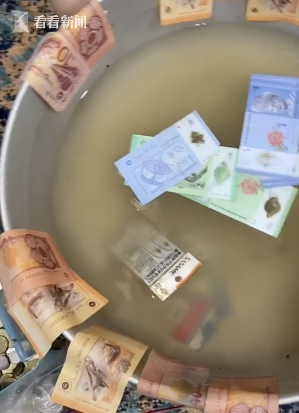 视频中,盆内用来“洗钱”的水变成了浑浊的泥水。她表示,由于洪水来得太突然,她完全来不及拿钱就立刻逃命,导致这些钱在水中泡了2天,幸亏完好无损,才不至于造成严重损失。