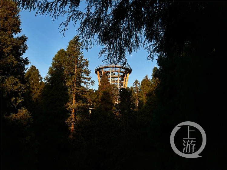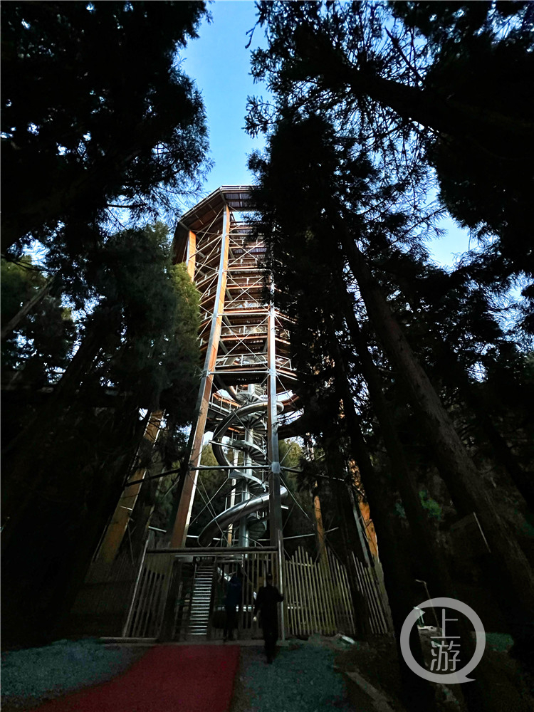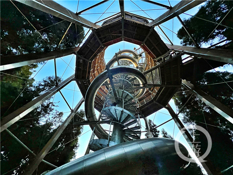 将他们送上高空的是营地的“森林之眼”,沿着螺旋通道上行,这座7层塔状建筑全长720米,高41米,塔顶海拔高度1880米,是目前全球树顶漫步塔中海拔最高的塔体。