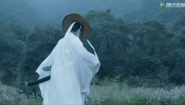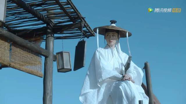 张天爱出场时的男装造型,一身白衣冷清又英气,腰佩双刀,斗笠遮面,颇有香港黄金时代武侠片风范。挥袖回眸之间,江湖侠客的英气扑面而来。