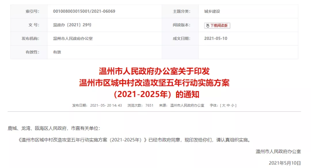 近期,《温州市区城中村改造攻坚五年行动实施方案(2021-2025年)》的出台,再一次引发市民们的热议。该方案围绕建设“五城五高地”工作目标,利用5年时间,通过“整村征迁”和“整治提升”等方式,将重点改造102个行政村。