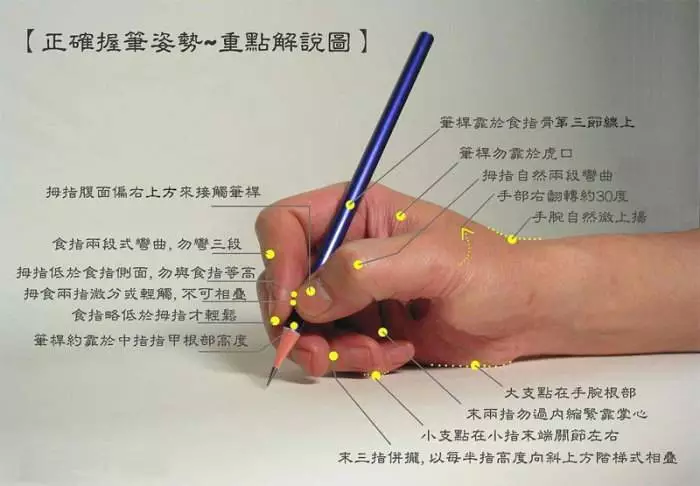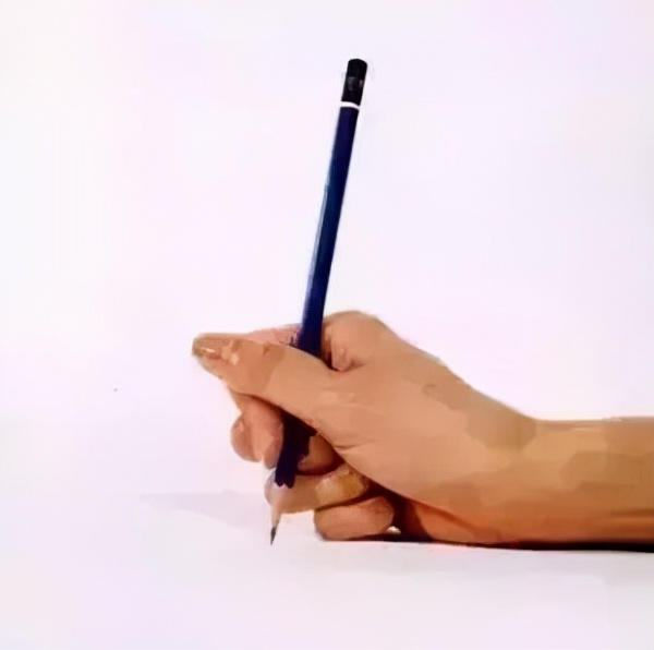 握笔时就好像握着一个拳头一样,手特别靠下。