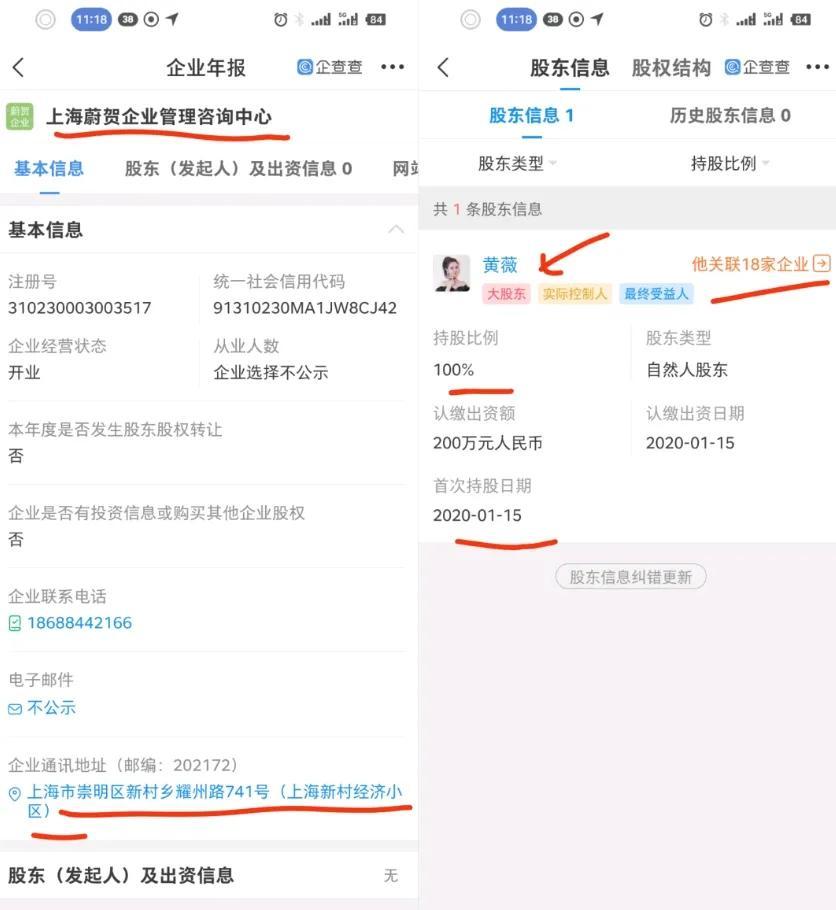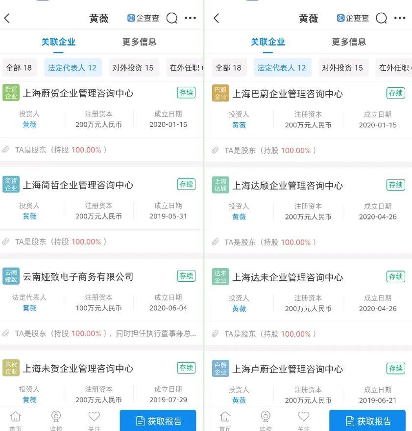 根据企查查搜索"黄薇"关联的企业能够查到薇娅个人独资100%公司有8家。比如薇娅上海蔚贺企业管理咨询中心就是100%独资的公司,并且位于上海崇明岛,远离谦寻杭州总部。而崇明岛被称之为"避税洼地",个人独资企业不再缴纳企业所得税,只对投资者个人取得的生产经营所得征收个人所得税。
