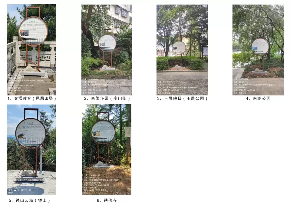 标识牌版面内容为景区城范围内的景物景点介绍,包含了文塔凌霄、西渠环带、玉屏映日、南湖公园、钟山云海以及铁佛寺6个景点。