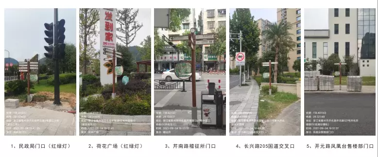 在城区内5条主干道交叉口的关键节点设置了人行指示牌,标识牌版面由景区城全景导览图和景物景点指向牌组成,对城区范围内的旅游集散中心、景物景点、美食街区和公共厕所等场所进行导览。