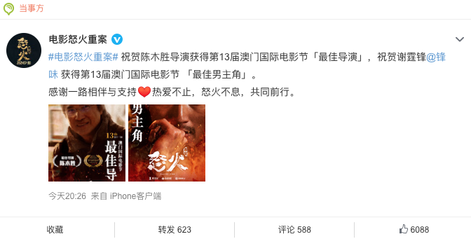 此次,谢霆锋凭借《怒火·重案》在澳门国际电影节上获得影帝,也是继2013年在华鼎奖上凭《消失的子弹》获得影帝后再一次卫冕影帝之名。