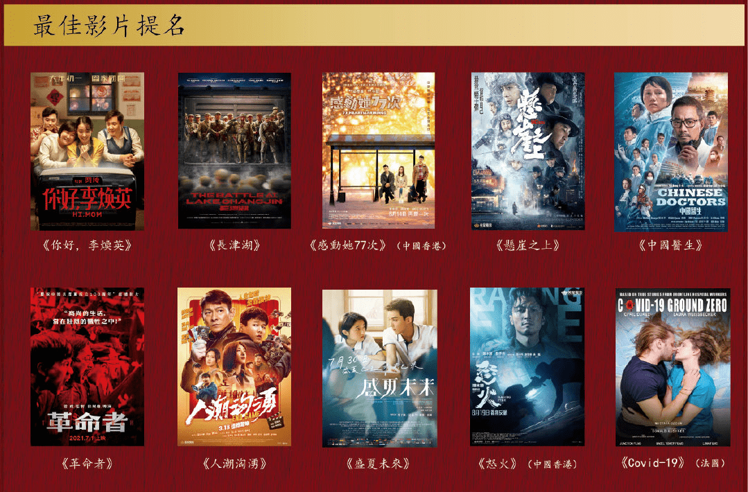 其中《长津湖》、《中国医生》、《悬崖之上》、《人潮汹涌》和《怒火·重案》等获得提名最佳影片