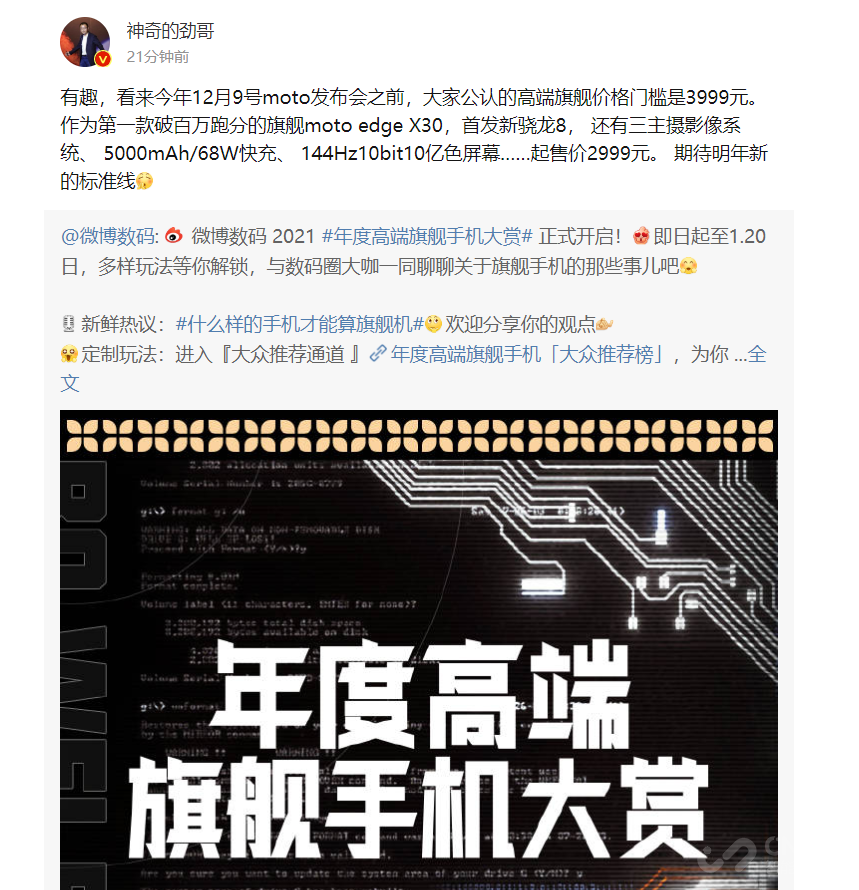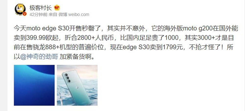博主极客村长也一语道破了moto edge S30抢手的原因,国外卖2800+人民币,国内仅1799元,便宜了千元多,即便现在的骁龙888+手机都普遍在3000元以上(比如魅族3699元、小米MIX 43999元),就连近期发布的iQOO Neo5s,搭载的是骁龙888都要2699元,可想moto edge S30是有多香了。