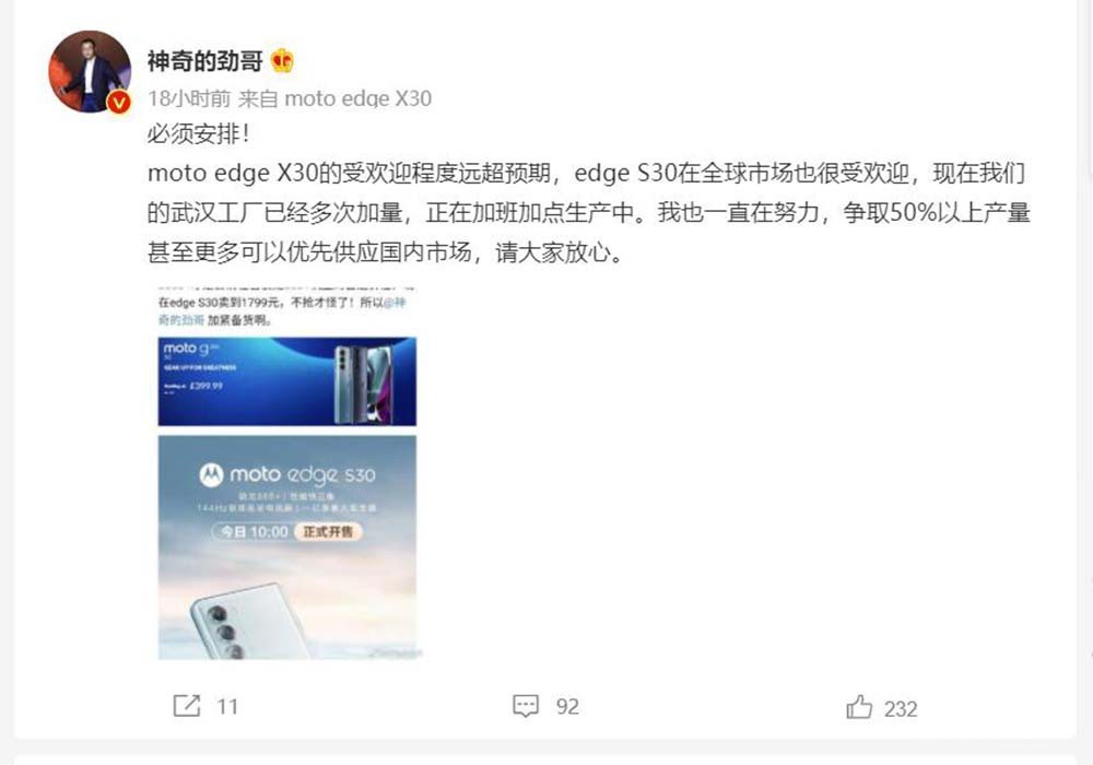 早前劲哥就表示moto edge S30在武汉工厂已经多次加量,产品正在加班加点生产中,会争取50%以上产量,并且会优先供应国内市场。所以moto的备货还是很给力的,可奈何抢得人实在是太多了。