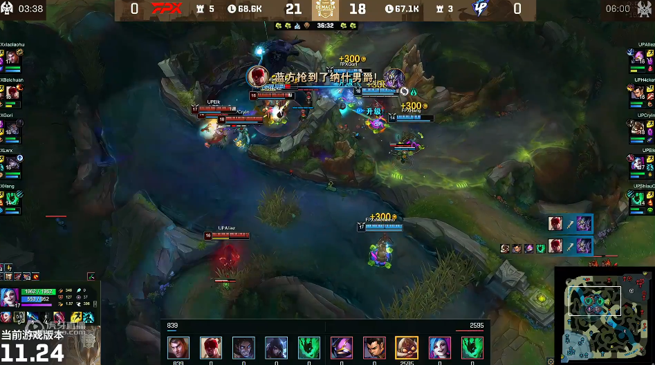 FPX和UP两队争夺德杯晋级半决赛的名额,双方上的都是主力选手。FPX第一局打的很糙,前面击杀领先,两波龙坑团让ELK金克斯杀起来。后面还是因为UP打大龙,骇客惩戒不稳,被北川抢到大龙,FPX留人打断UP人员回城才结束比赛。