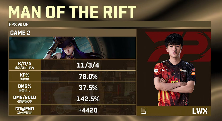 经过第一局操作与配合上的失误,FPX调整的很快,尽管第二局和第三局还稍有瑕疵,但上单小老虎、中单Gori和Lwx三人站出来,尤其是Lwx的女警,对线和团战都打出很高的操作,连拿两把MVP,看的观众直呼666。