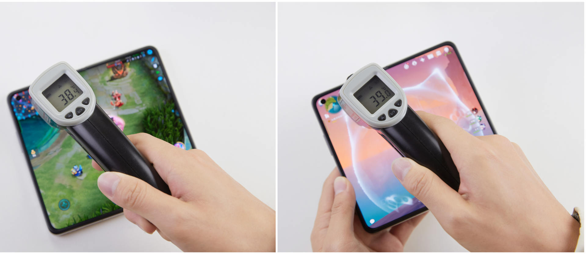 现在还有部分用户担心折叠屏的散热能力,其实例如OPPO Find N这样用来大屏大机身设计,换言之也增大了散热面积,因此真实的散热效果是比较可观的。经过实际测试,开启高清画质模式下,游戏一局王者荣耀之后屏幕正面温度为38.4°C,游戏半小时原神之后屏幕正面温度为39°C,两款主流大型游戏过程中没有明显的发热烫手现象。