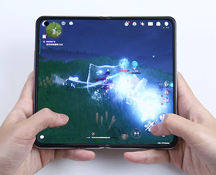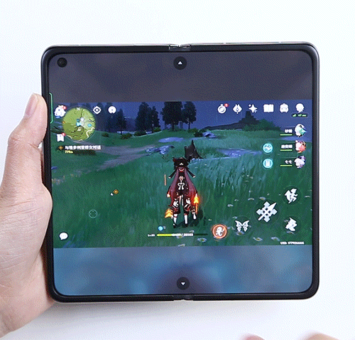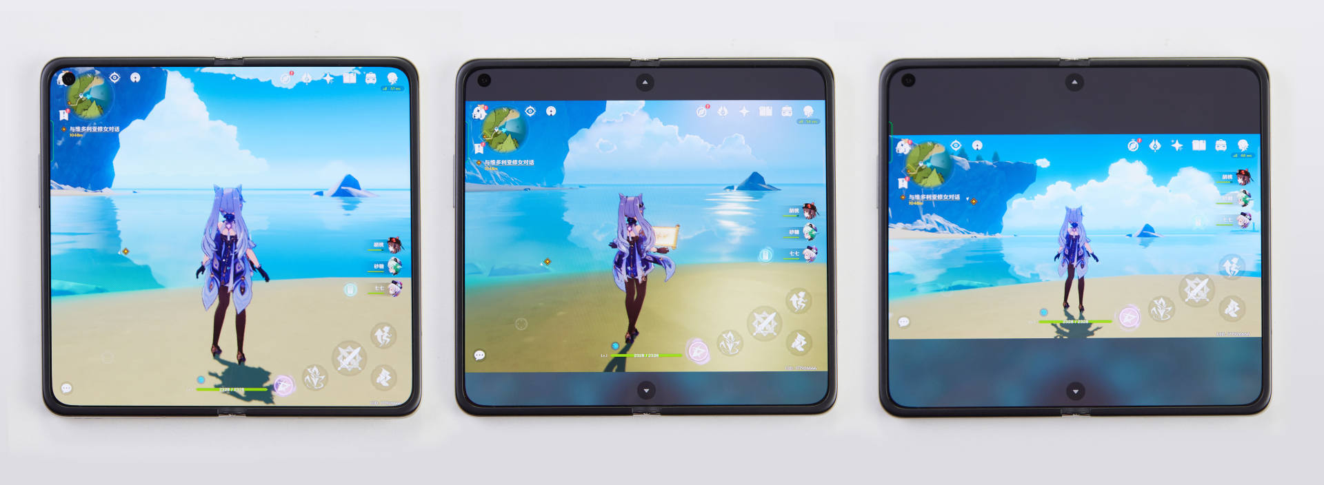 而相对于玩原神这款游戏, 我认为全屏效果会更加给力,因为原神的玩法主要是控制人物形象,1:1的比例能够放大人物细节,操控起来跟手性会更好,画面衔接会更加生动细腻。而在细节体验方面,OPPO Find N竟然还能调整游戏画面在屏幕里面的显示位置,可以将游戏画面放到中间,也可以放到屏幕上方或者下放,可以满足不同人群的操作或者握持习惯。而且OPPO Find N搭载的LTPO屏幕还能带来清晰色彩显示,还能进一步降低屏幕功耗。对于大屏游戏体验,OPPO Find N这次给到了人性化的调节模式和硬件支撑。