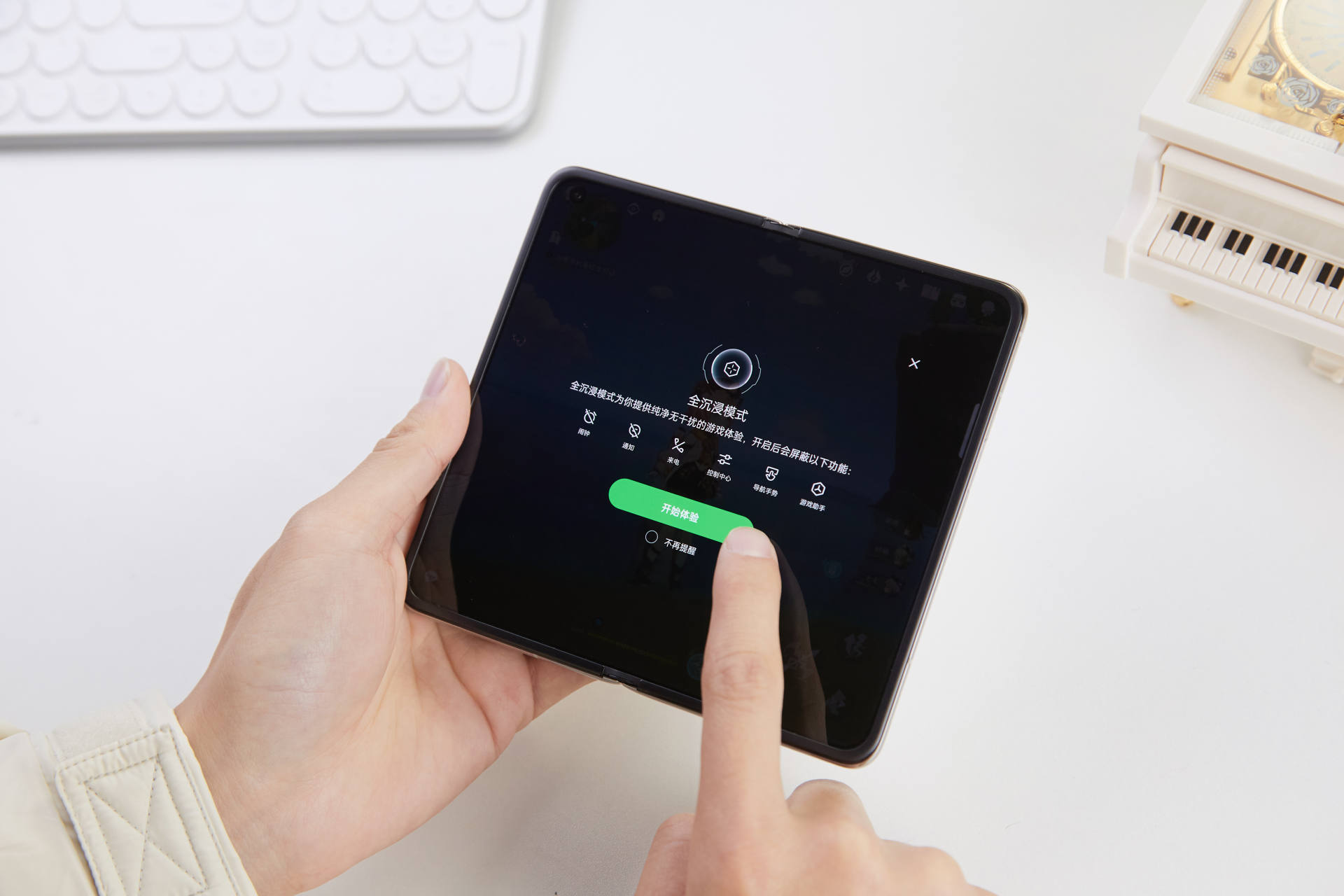 体验下来之后,还发现OPPO Find N内置的ColorOS 12带来了诸多游戏优化功能,比如有此前大家熟知的全沉浸模式,打开后即可进入专属的游戏状态,可以屏蔽通话信息通知,还能调节专业的游戏手感。而人性化的功能在于,在在全沉浸游戏模式下,不同担心折叠屏双指分屏、闪窗等问题的出现,可以玩得更加安心。
